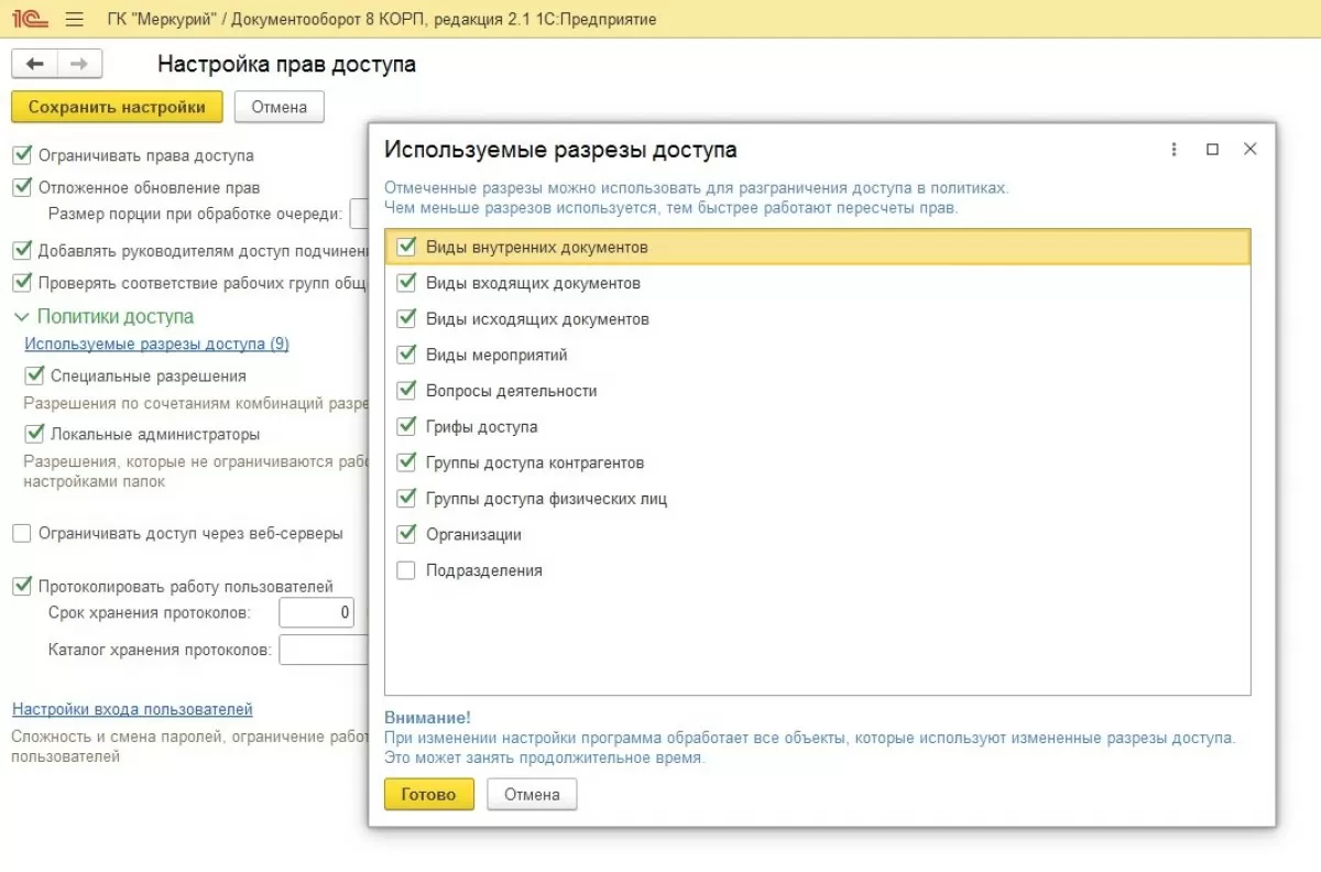 Права доступа настраиваются в соответствие с Политиками доступа программы в следующих разрезах: