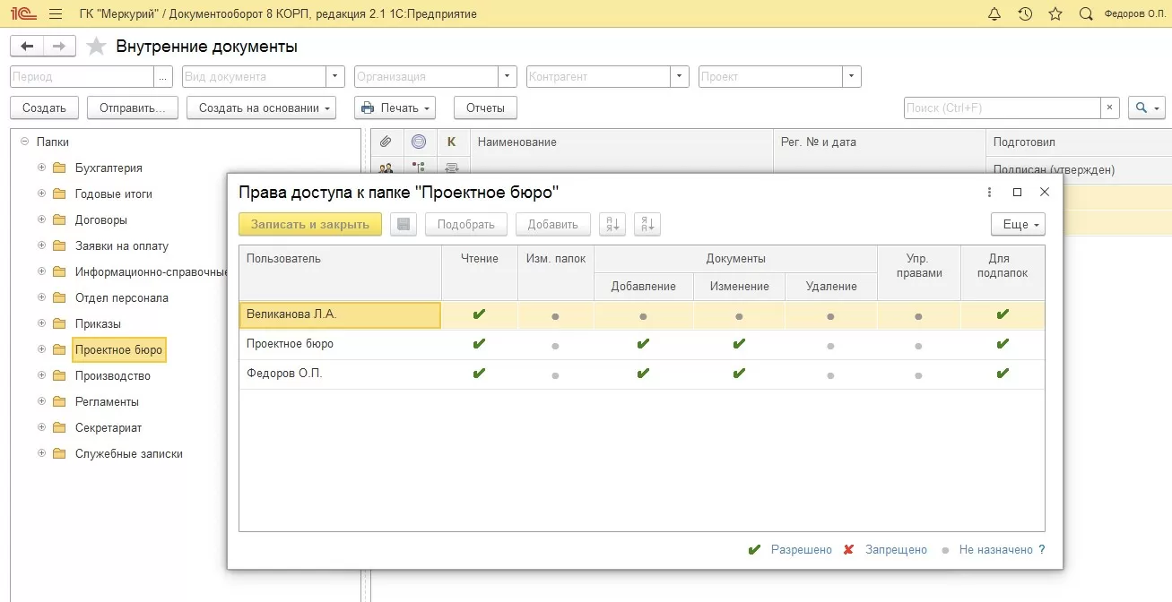 Мы также помним из вышеописанного, что права доступа настраиваются и по папкам размещения документов.