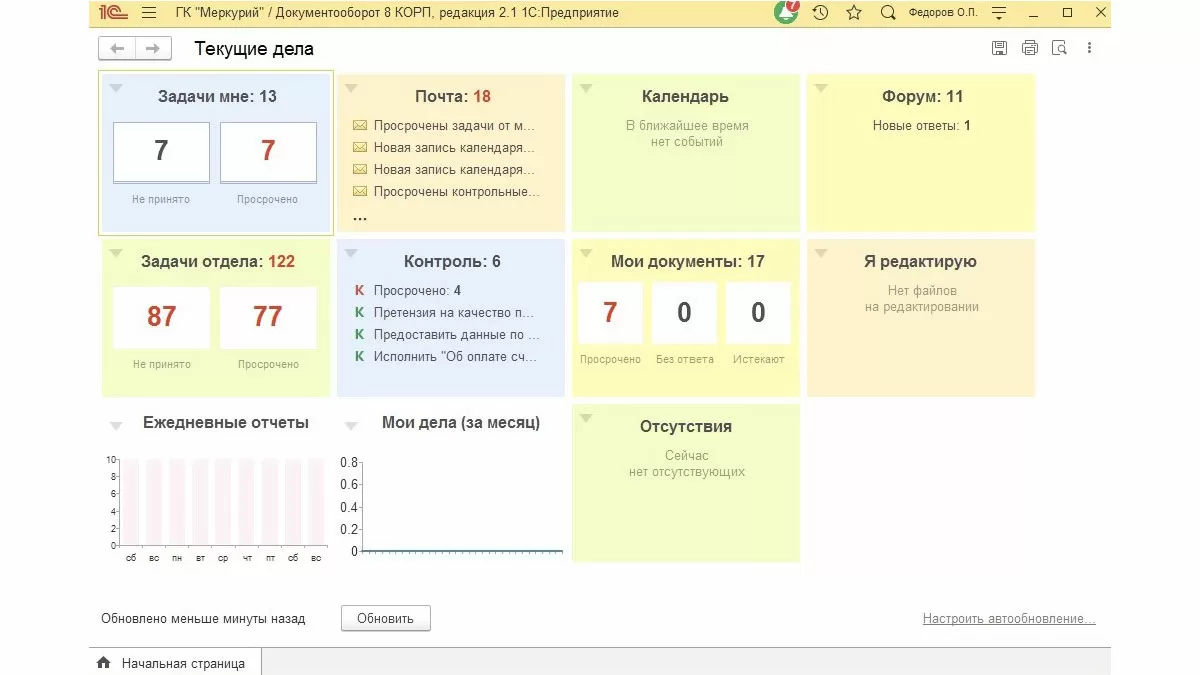 Программа 1С:Документооборот 8 (далее рассматриваем функционал на примере самой популярной у пользователей версии конфигурации КОРП) позволяет навести порядок с документами, организовать взаимодействие сотрудников компании, обеспечить структурирование информации. На основе 1С:Документооборот 8 КОРП можно создавать самые различные полезные решения для бизнеса, одно из них – это электронный архив документов.