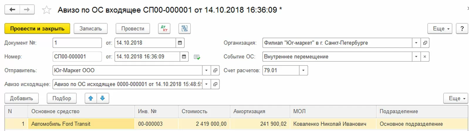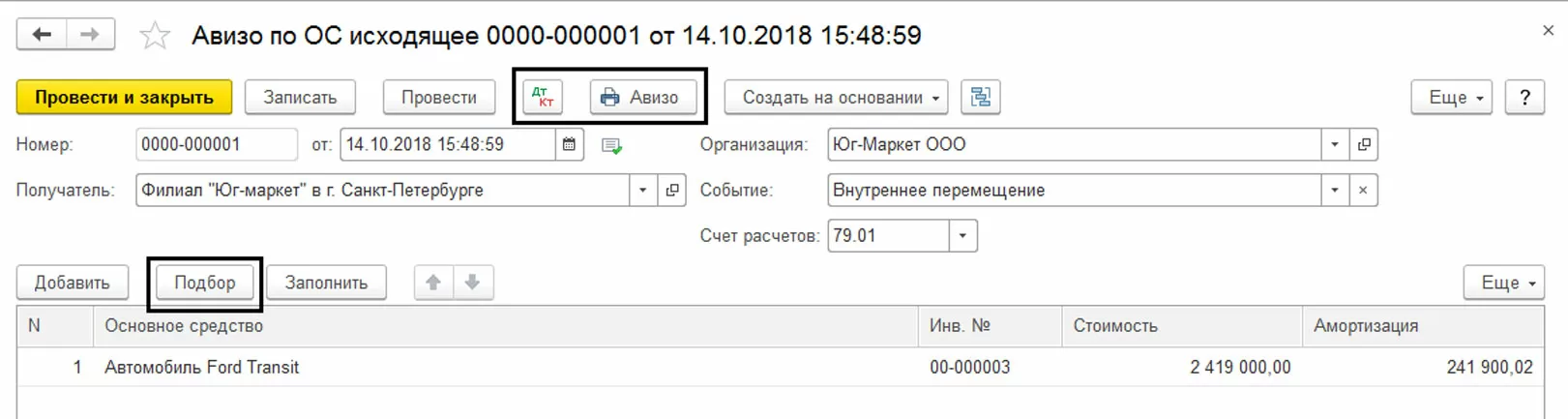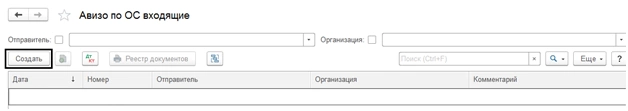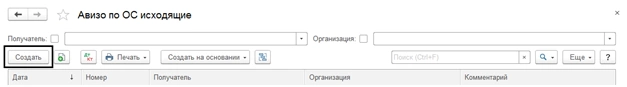 Рассмотрим пример: Из головной организации в филиал передан купленный новый автомобиль. Отразим документ «Авизо по ОС исходящее» в программе. Создадим и заполним его через «Создать» в одноименном журнале операций.