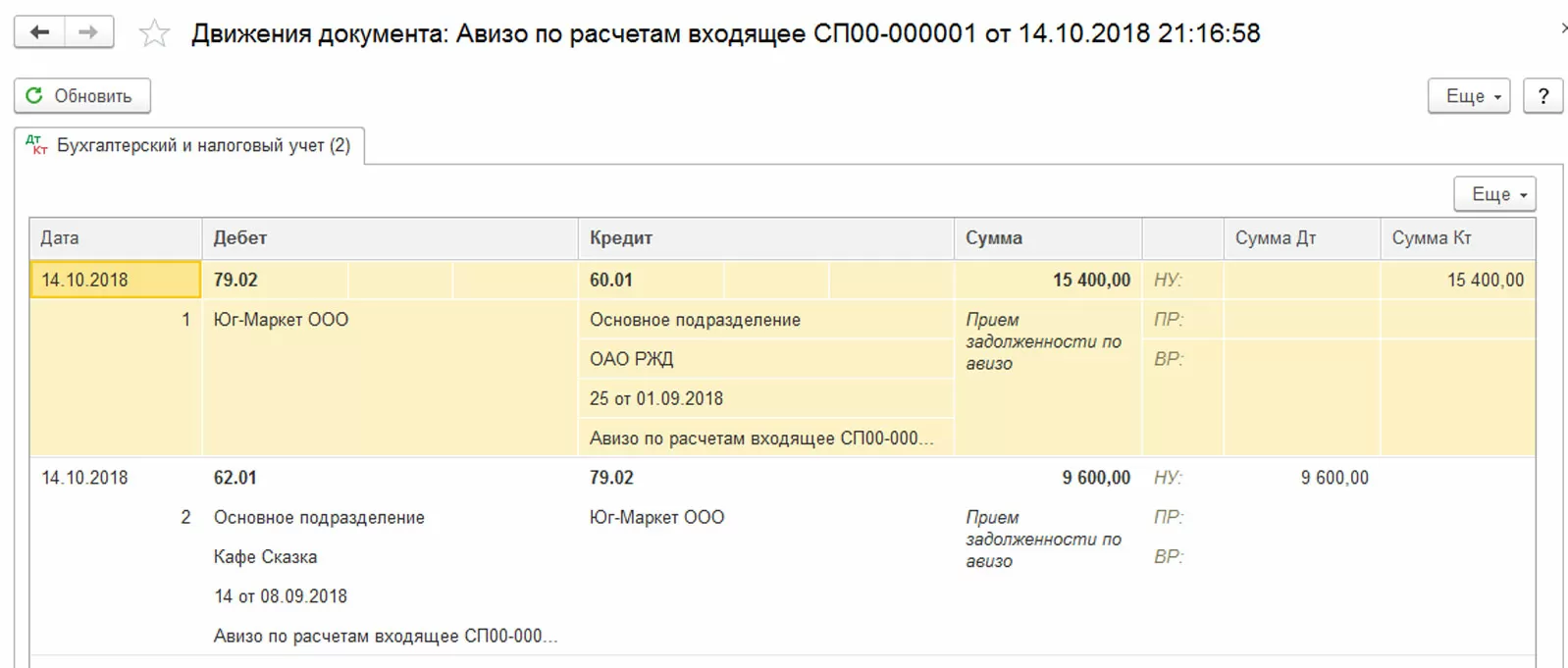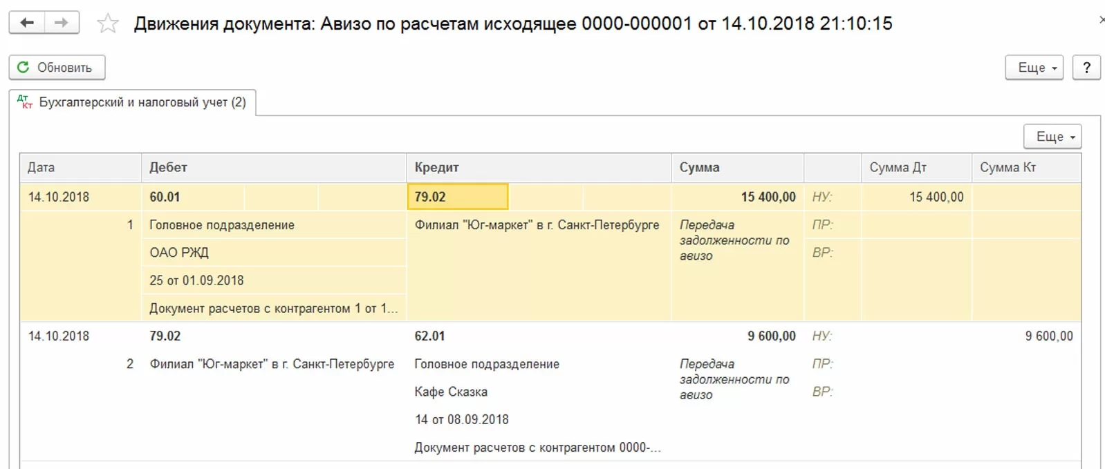 Для отображения взаимодействия структурных единиц одной компании реализован специфический бухгалтерский документооборот, предусматривающий два вида авизо: