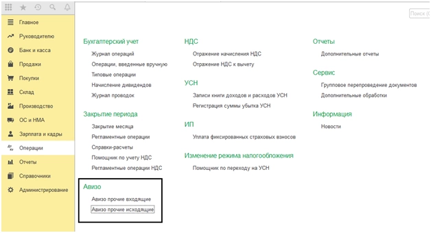 Одним документом может быть передано несколько сумм по разным счетам бухучета. Исходящие и входящие авизо по прочим операциям находятся в разделе «Операции».