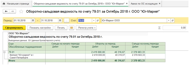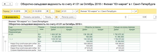 Сформировав оборотно-сальдовую ведомость по счету 41.01 «Товары», мы видим, что за нашим филиалом числятся переданные товары из главного подразделения (меню «Отчеты-Оборотно-сальдовая ведомость по счету»).
