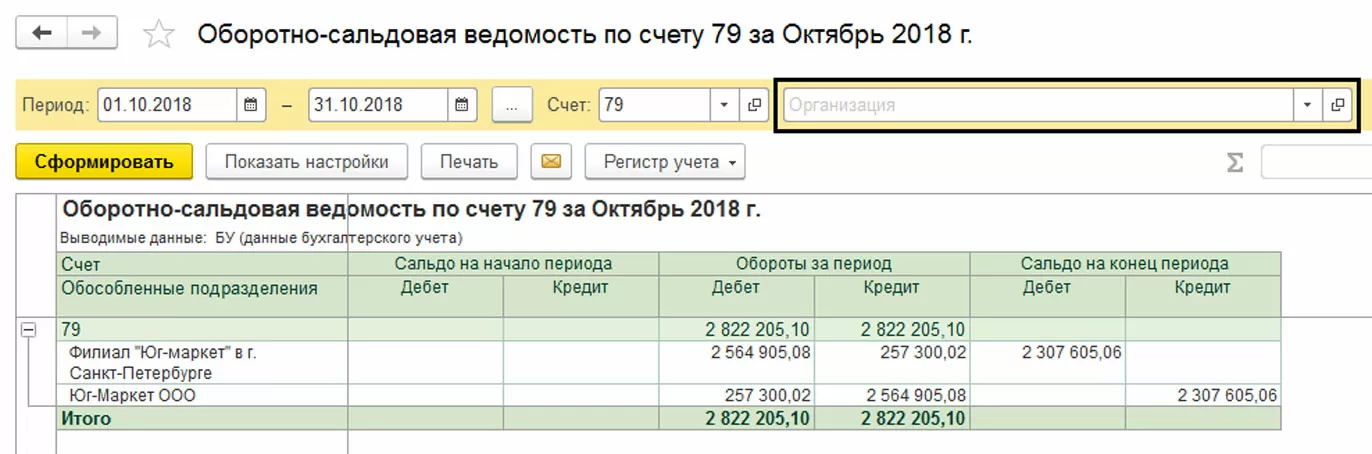 Благодаря отчетам по операциям авизо (например, ОСВ по счету 79) главный бухгалтер центральной бухгалтерии может оперативно получить информацию о том, по какой аналитике и между какими филиалами отражены взаиморасчеты, и убедиться в том, что сальдо по счету 79 в целом по предприятию равно нулю. При формировании отчета поле «Организация» остается пустым, что дает возможность проанализировать данные в целом по всем организациям.