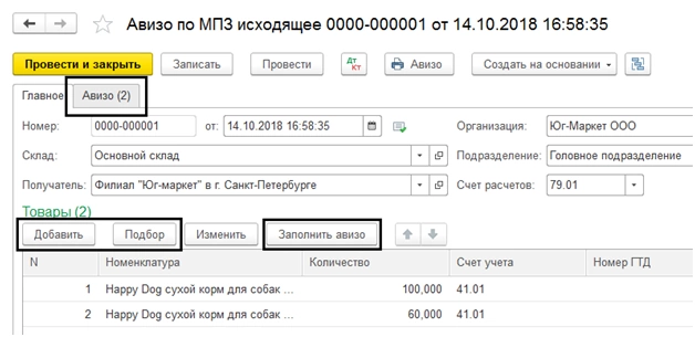 Создаем и заполняем авизо – заполняем «Получателя» и «Склад», «Организацию» и «Подразделение» отправителя. С помощью кнопок «Добавить» или «Подбор» добавляем номенклатуру в табличную часть. В нашем примере мы передаем товары. По кнопке «Заполнить авизо» выбранные позиции переносятся на вторую закладку документа «Авизо».
