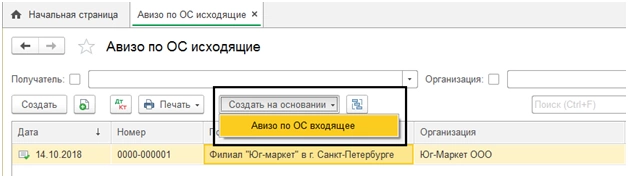 Входящий авизо можно ввести на основании исходящего. Для этого в журнале исходящих, указав нужный документ передачи, надо нажать «Создать на основании» и выбрать наш документ.