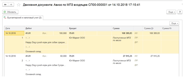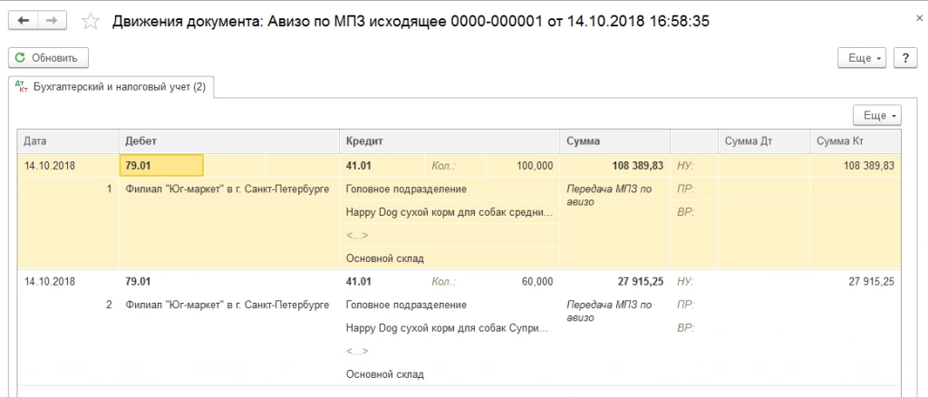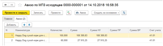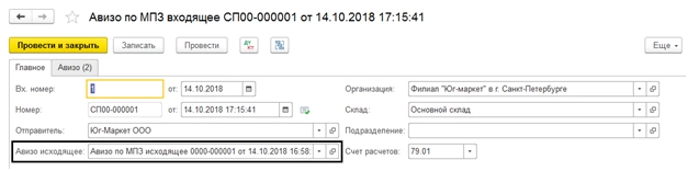 На основании данного документа принимающее подразделение может создать входящее авизо по МПЗ. Все данные заполняются автоматом из документа основания.