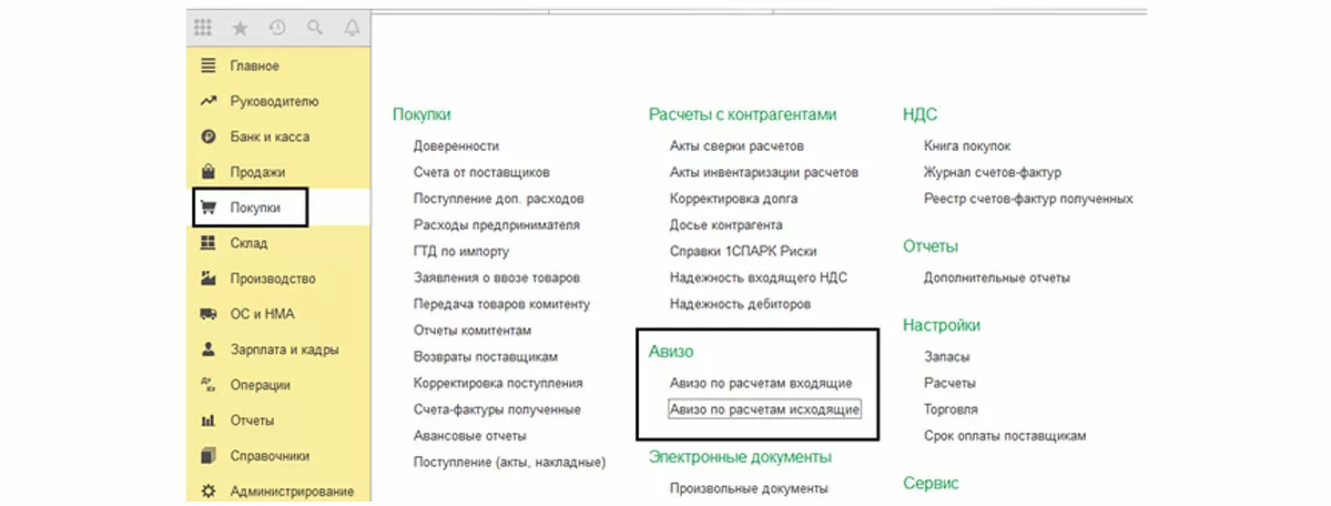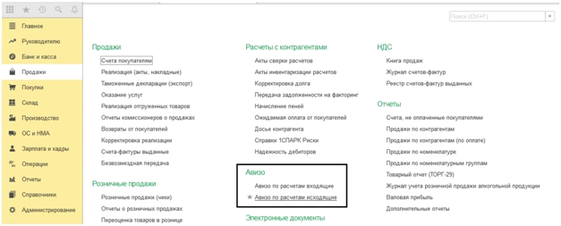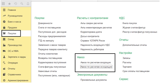 Два вида документов авизо по расчетам – исходящие и входящие можно найти в меню «Покупки» или «Продажи».