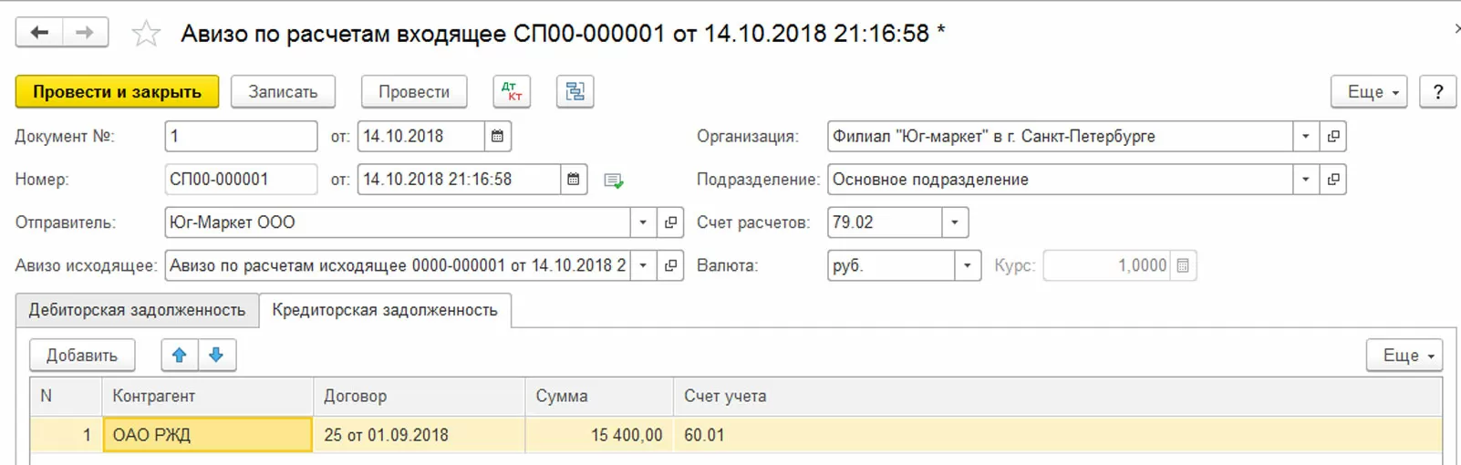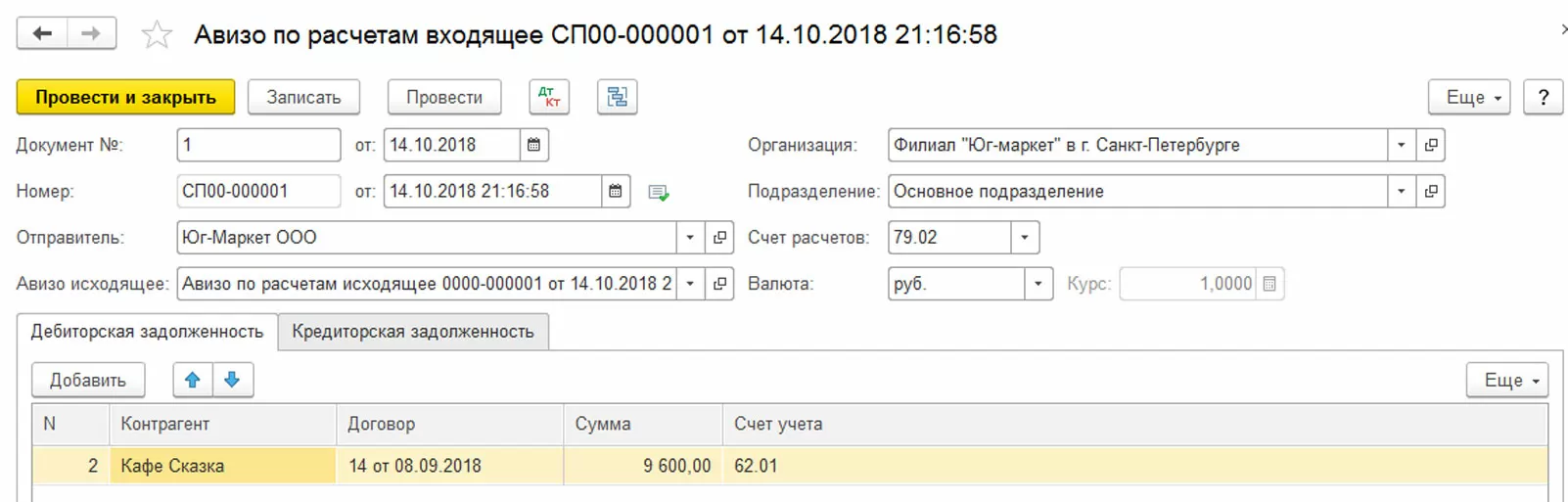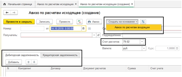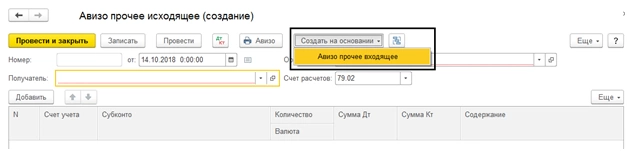 Порядок работы с документами такой же, как описан выше на примерах. Заполнение шапки и табличной части, в которой указывается передаваемый счет учета, сумма по дебету или по кредиту и содержание операции. И на основании исходящего авизо также можно создать входящее.
