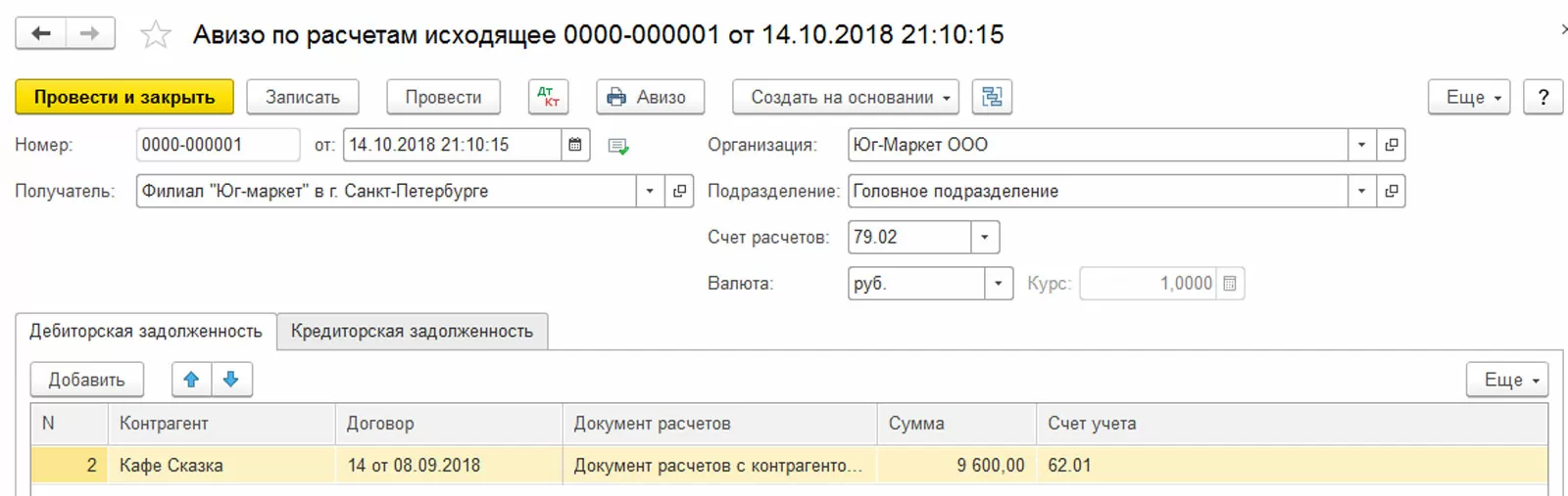 Документами «Авизо» мы отразили переданную кредиторскую задолженность филиала для оплаты главным подразделением, на котором будет числиться задолженность филиала.