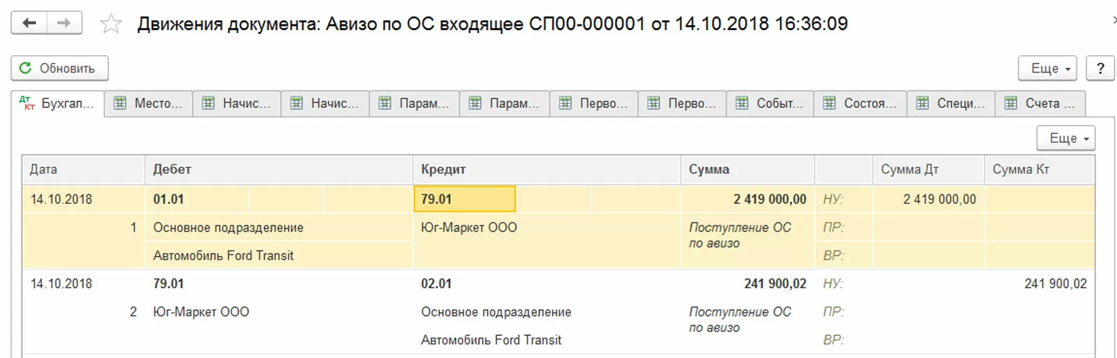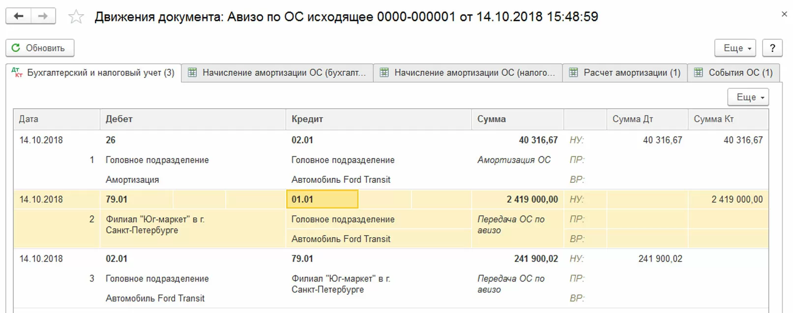 В результате проведения сформировались проводки по поступлению ОС по авизо – стоимость ОС и начисленная амортизация.