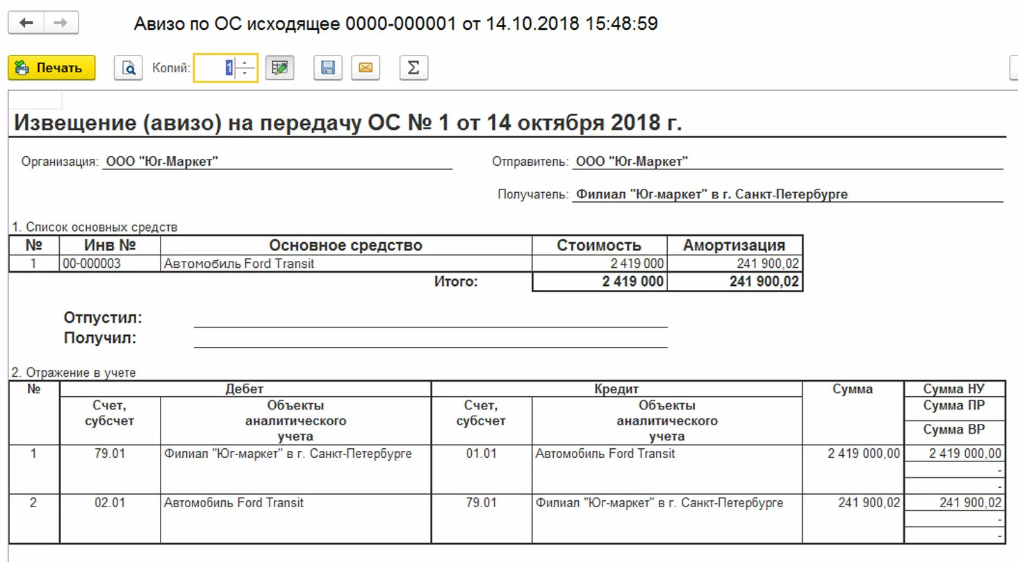 Также в бухгалтерской программе 1С предусмотрены специальные документы типа авизо по объекту передачи: