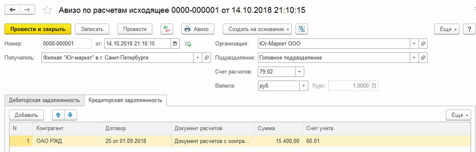 Исходящее авизо по расчетам используют для направления дебиторской и кредиторской задолженности между главным и обособленным подразделениями, выделенными на отдельный баланс. В одном документе можно заявить об обеих разновидностях долгов по разным договорам. В таблице отражается информация о контрагенте, документы, подтверждающие расчеты, счет учета долгов, сумма операции. Отдельно предусмотрены закладки для передачи дебиторской и кредиторской задолженности. Если передается долг в валюте, то указывается, в какой именно. На основании «Авизо по расчетам исходящего» можно ввести документ «Авизо по расчетам входящее».