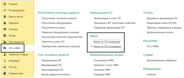 Оба вида авизо – исходящие и входящие – по ОС находятся в пункте «ОС и НМА».