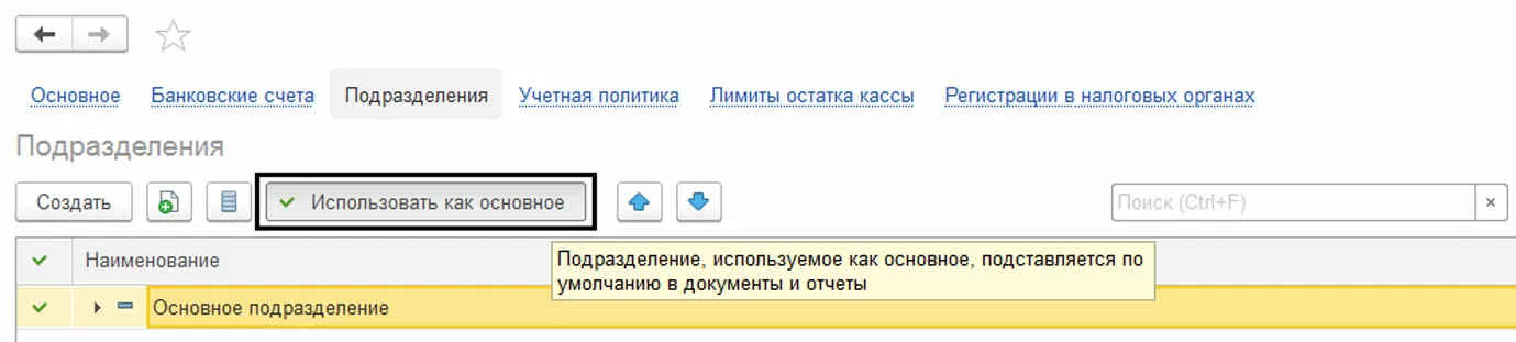 Перейдя в справочник «Подразделения», можно также установить отметку на подразделение «Использовать как основное».