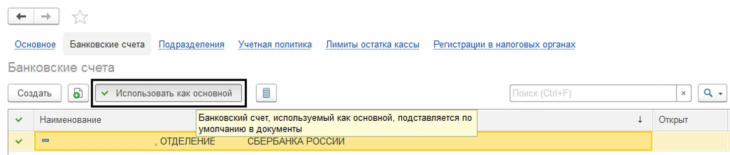 Если в организации имеется несколько банковских счетов, то соответственно в справочнике «Организации-Банковские счета» мы можем установить, какой из счетов использовать по умолчанию, нажав кнопку «Использовать как основной».