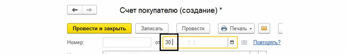 Еще одной небольшой хитростью является то, что при заполнении даты документа, мы укажем только число и нажмем кнопку «Enter» на клавиатуре, у нас автоматически проставится текущий месяц и год. Аналогично, если мы укажем дату и месяц (не текущий, любой другой), у нас автоматически добавится текущий год.