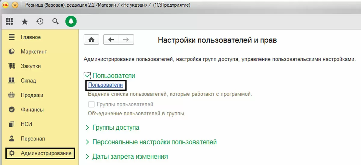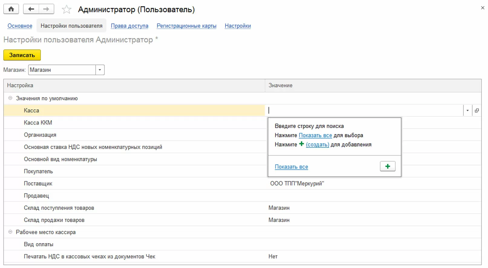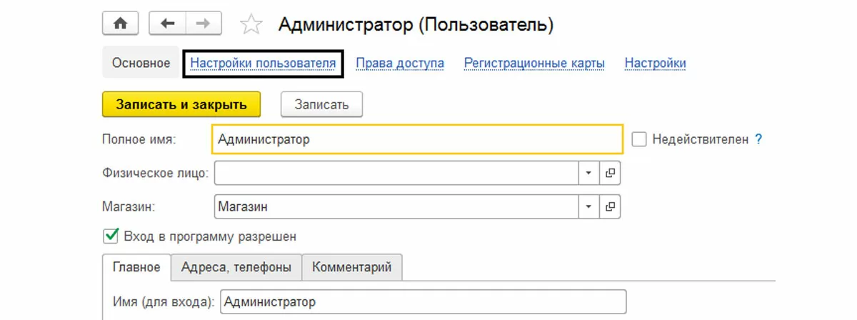 Здесь реализована более широкая настройка значений по умолчанию для пользователя. Настройки пользователя доступны в разделе меню «Администрирование-Пользователи».