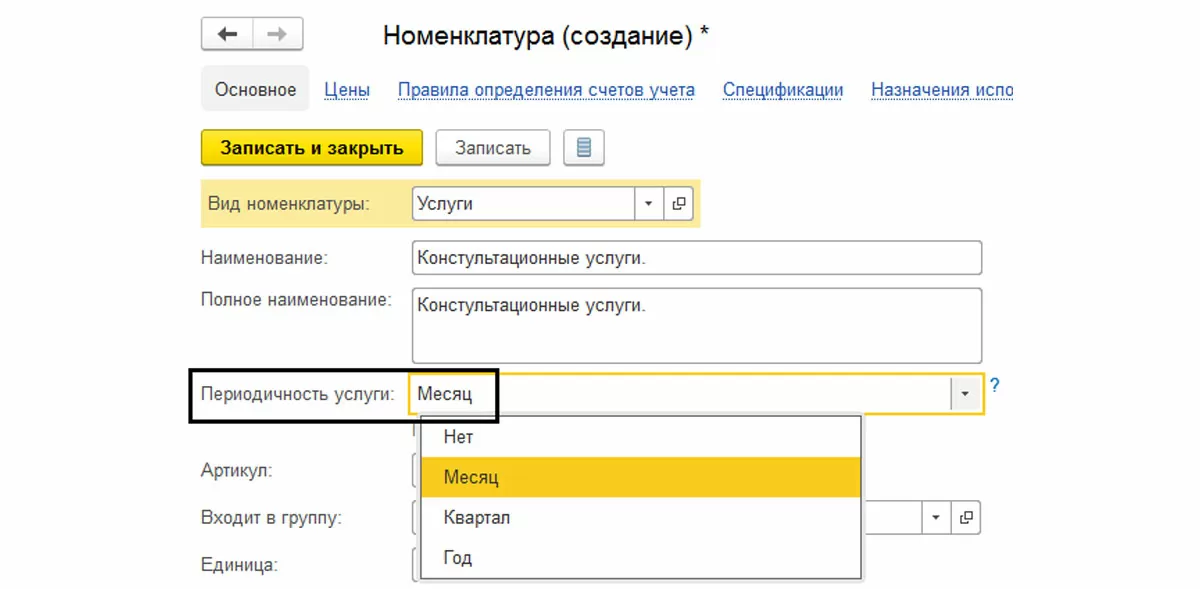 Помимо настроек автозаполнения, в программах 1С есть некоторые хитрости, которые знают эксперты и консультанты 1С, но рядовые пользователи могут просто не обращать на них внимание. Например, в карточке «Номенклатура», при выборе «Вид номенклатуры-Услуга», есть поле «Периодичность услуги».