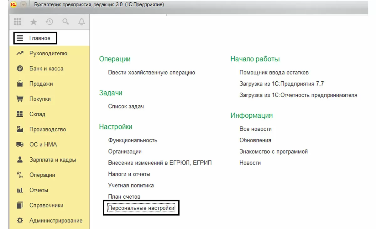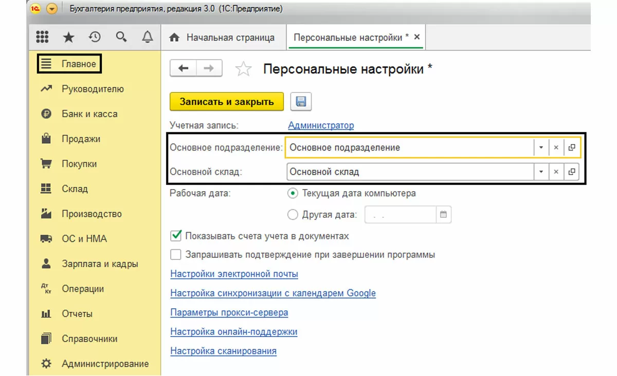 В разделе меню «Главное-Персональные настройки», можно задать по умолчанию значения для полей «Основное подразделение» и «Основной склад». Если учет в программе ведется по нескольким организациям, то здесь же доступна установка организации по умолчанию.