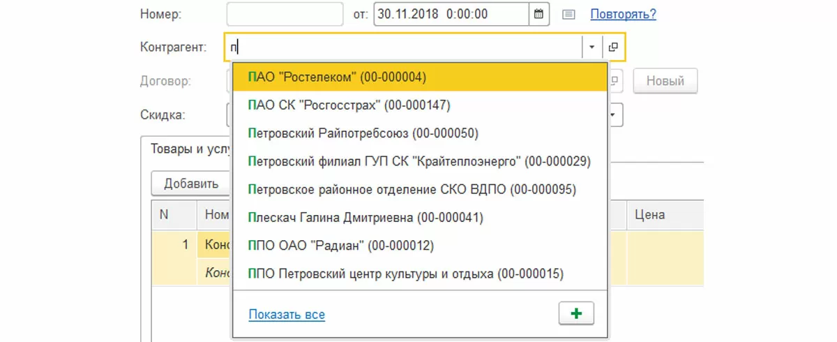 При вводе контрагента, если вы забыли название, достаточно начать вводить первые буквы и программа автоматически начнет поиск. Останется только выбрать из предложенного списка.