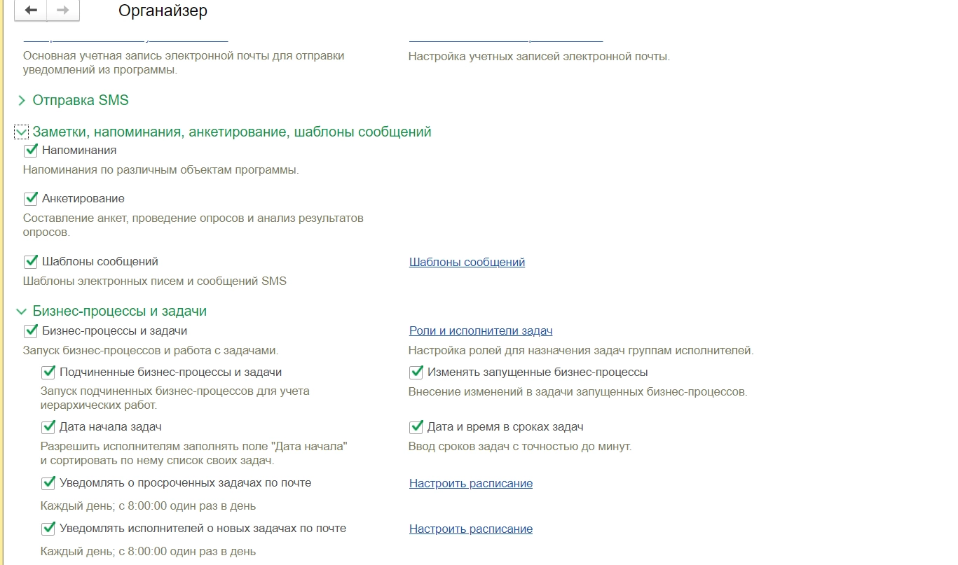 В настройках программы можно задать также расписание уведомлений сотрудникам, в том числе, используя электронную почту.