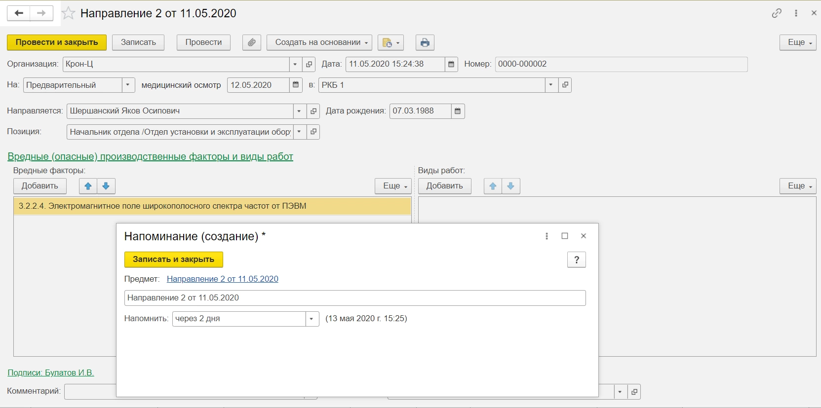 На основании приема на работу (нажатием одной клавиши) можно создать направление на предварительный медосмотр. Все данные кандидата и будущего рабочего места подтягиваются из штатного расписания программы.
