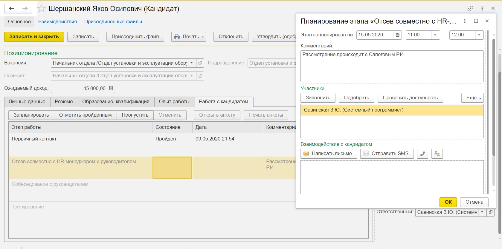 Данная форма содержит исчерпывающее количество информации о кандидате, доступное для просмотра всем заинтересованным сотрудникам, и позволяет сократить время на планирование и непосредственное взаимодействие с потенциальным сотрудником. При этом планировщик задач позволяет правильно распределить время работы рекрутера и не допустить ситуаций, когда двум соискателям назначили интервью в один временной интервал. Если кандидат находится в «черном списке» компании, программа предупредит вас об этом.