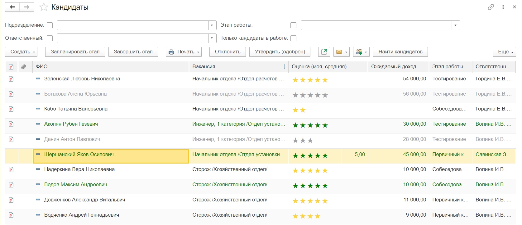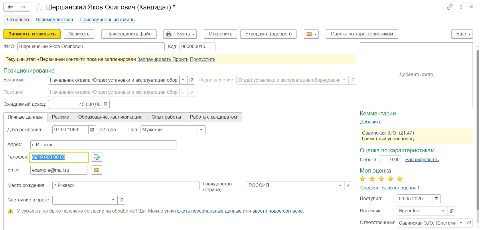 Для одобрения или отклонения кандидатуры соискателя нужно просто нажать одну из двух соответствующих клавиш, при этом данные кандидата можно сохранить в базе. 1С:ЗУП КОРП имеет функционал проведения электронного интервьюирования кандидата с возможностью сравнения анкет между собой, к которому можно обратиться для уточнения при принятии решения.