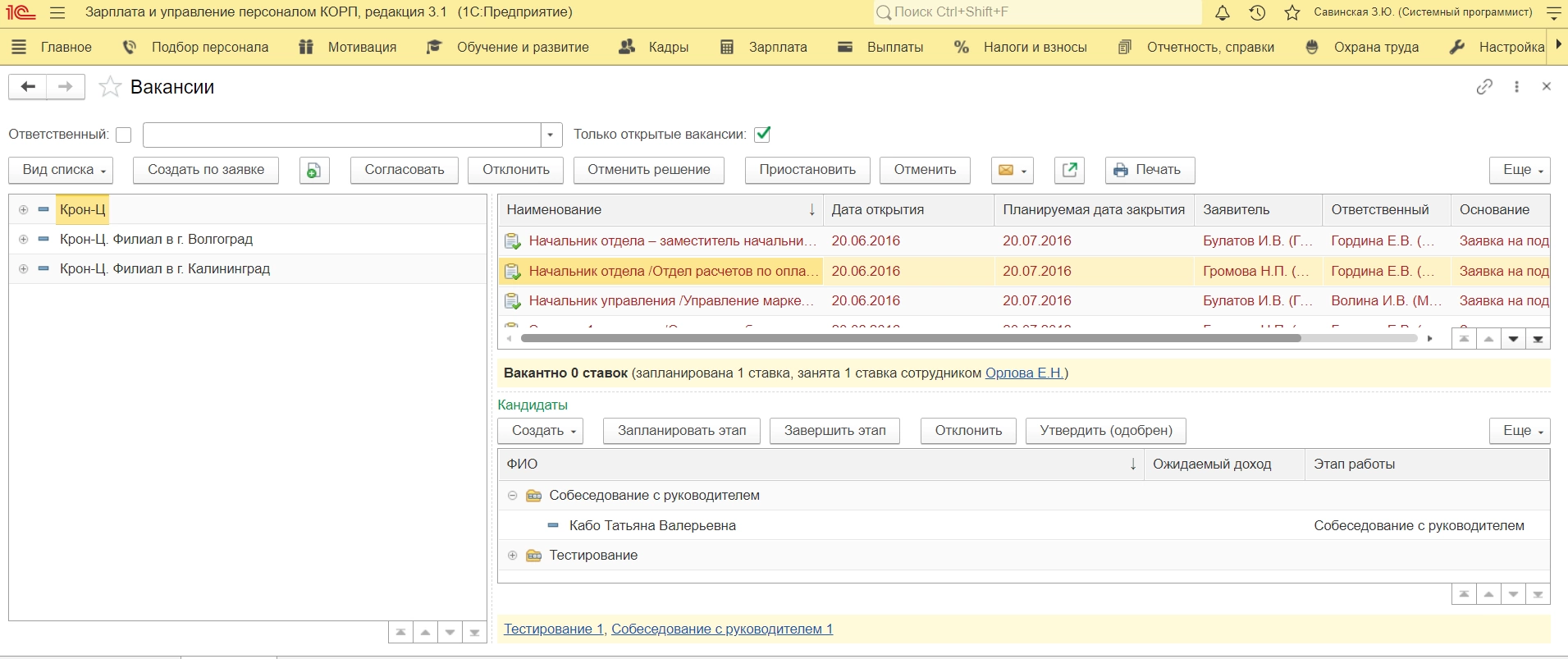 Понятно, что количество и содержание плюсов и минусов для каждого предприятия будет своим (это зависит от численности штата сотрудников, географического охвата, количества должностей и проводимой HR-политики), но все же положительных сторон будет больше. Чтобы это подтвердить, рассмотрим пример автоматизации рутинного процесса в управлении персоналом – подбор сотрудника на вакантную должность в программе «1С:Зарплата и управления персоналом» КОРП (пошаговую инструкцию по подбору персонала в 1С можно также найти на нашем сайте).