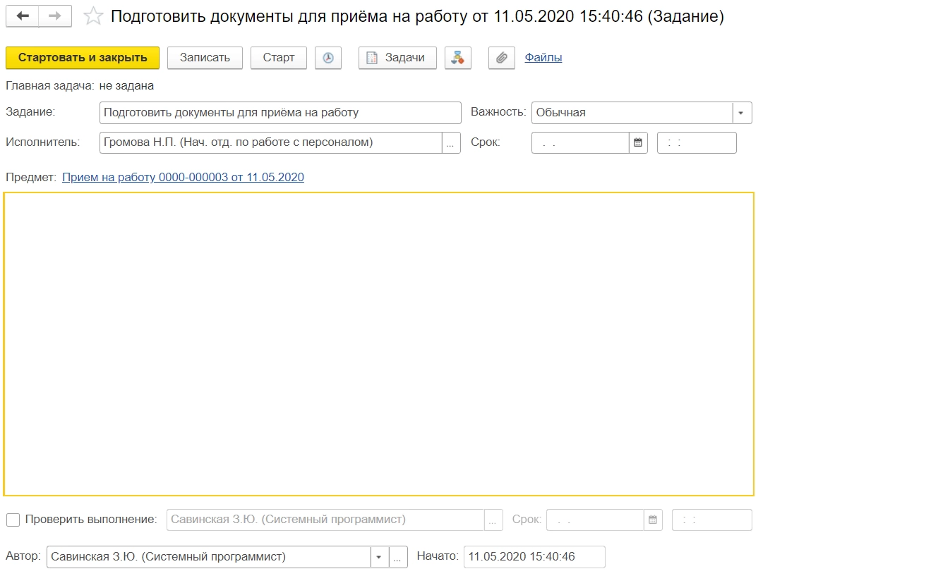 При передаче кандидата в отдел кадров для оформления документов, мы можем создать задание сотруднику кадровой службы, и точно также он получит уведомление в программе или по электронной почте, со ссылкой на документ, где содержится вся информация о принимаемом сотруднике.