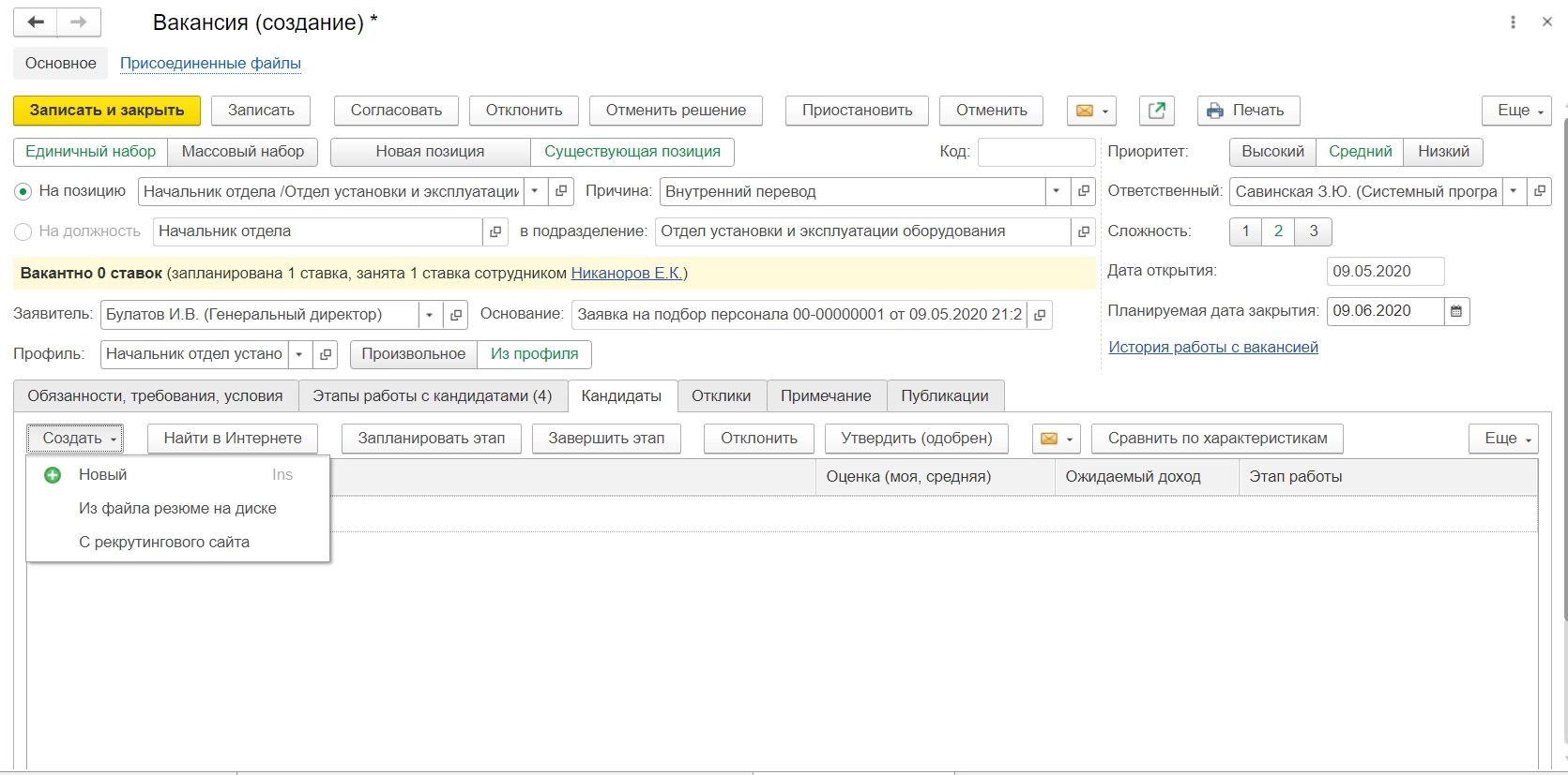 Конфигурация 1С:ЗУП 8.3 КОРП обладает широким функционалом для автоматизации процессов и задач, связанных с управлением персоналом, в том числе, полноценным HR-блоком. Для примера автоматизации процесса подбора сотрудника мы рассмотрим ситуацию, когда предприятию требуется руководитель отдела по установке и эксплуатации оборудования. Наша задача найти подходящего кандидата, предоставить его резюме для согласования и, если он нам подходит, то принять на работу в нашу компанию.