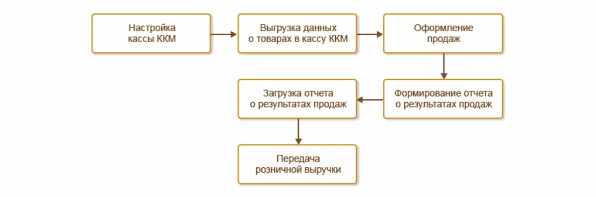 При продаже товаров через фискальный регистратор, информация о продаже моментально попадает в систему в виде документа «Чек ККМ». Благодаря этому можно в реальном времени контролировать выручку магазина и вести учет остатков товаров на складе магазина. В конце смены в 1С необходимо произвести закрытие смены, в результате чего на кассе будет распечатан Z-отчет, а в УТ11 будет создан документ «Отчет о розничных продажах», куда войдут все продажи по чекам, оформленным за отчетную смену.