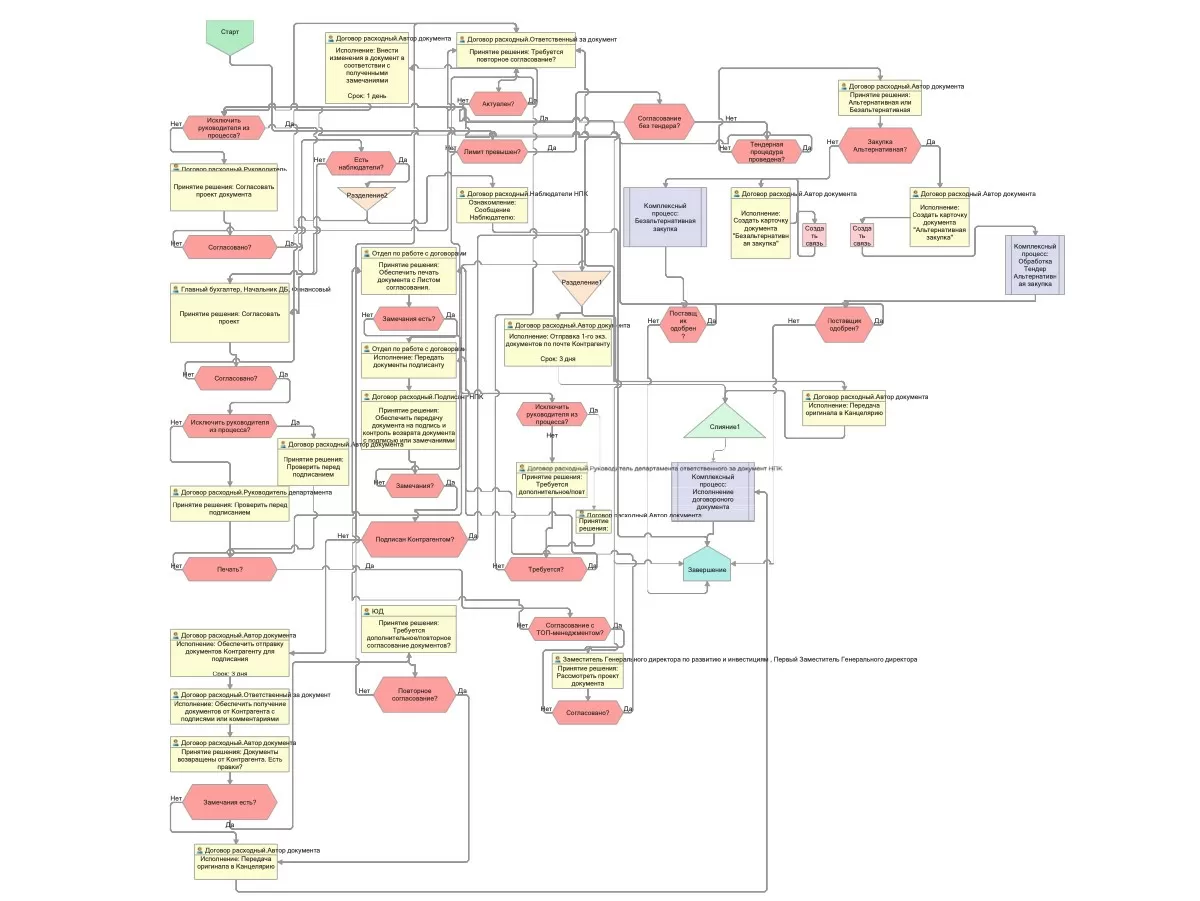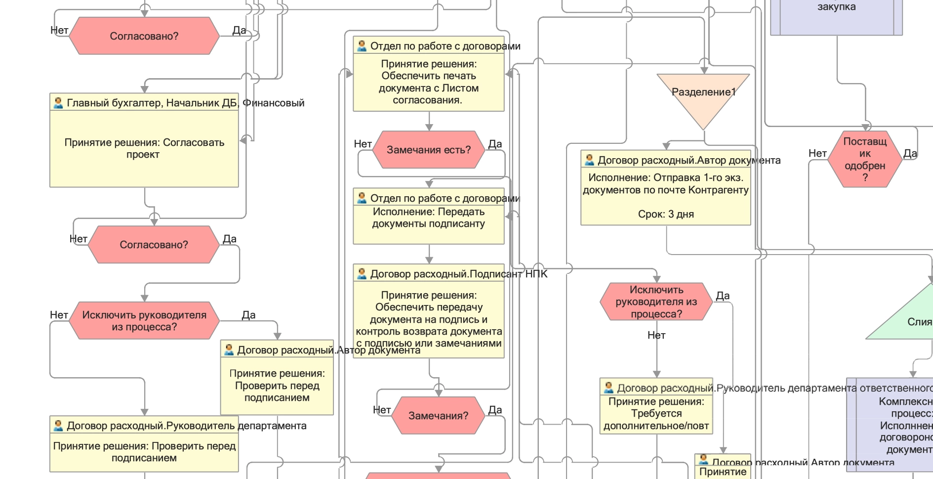 В реальных проектах при работе с документами обойтись элементарными процессами не получится. Практически все делается именно на комплексных. Это связано с тем, что процесс в реальности более сложен, чем просто «согласовать договор».