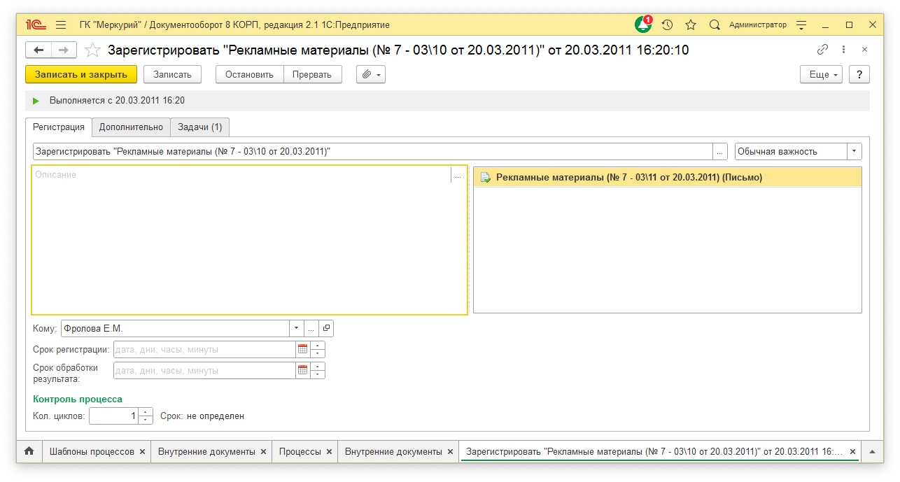Процесс регистрации позволяет автоматизировать регистрацию документов. Этот процесс не имеет смысла в отрыве от документа.