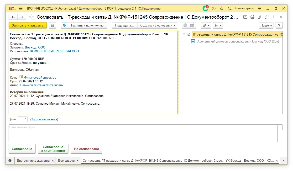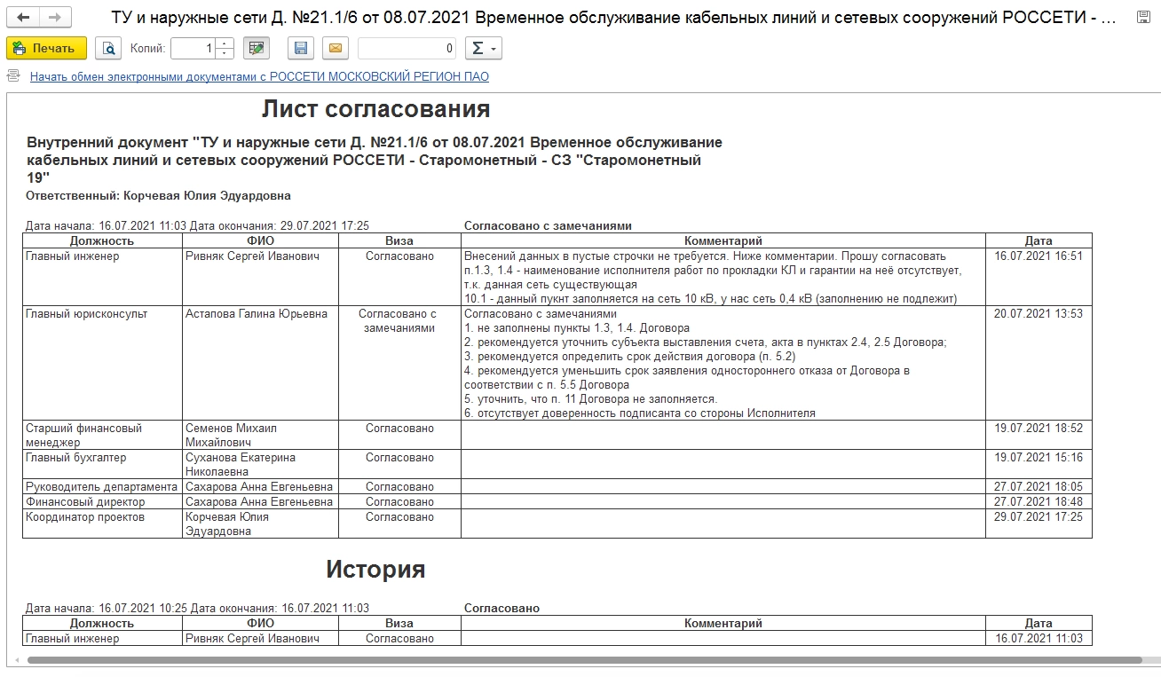 После согласования можно распечатать лист согласования с историей изменений. Часто лист согласования подшивается к договору при подписании документа генеральным директором. В листе согласования отражаются все замечания и дата с привязкой ко времени выдачи визы к договору.