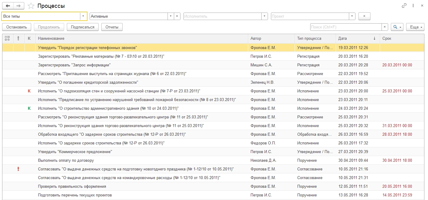 Это основные процессы, на основе которых строятся базовые взаимодействия между сотрудниками. Исходя из их наименований, понятно их назначение и что они делают. К элементарным процессам относятся: