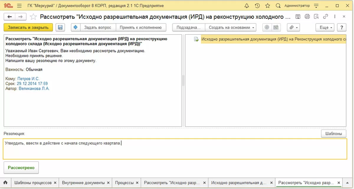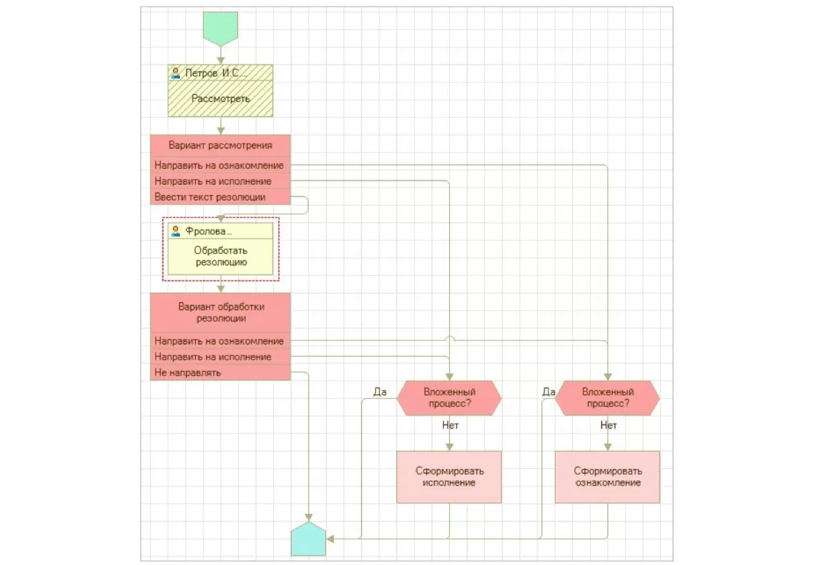 Рассмотрение – это процесс для получения резолюции, запрос решения от Руководителя. Как правило, этот процесс всегда имеет вложенный документ, который необходимо рассмотреть.