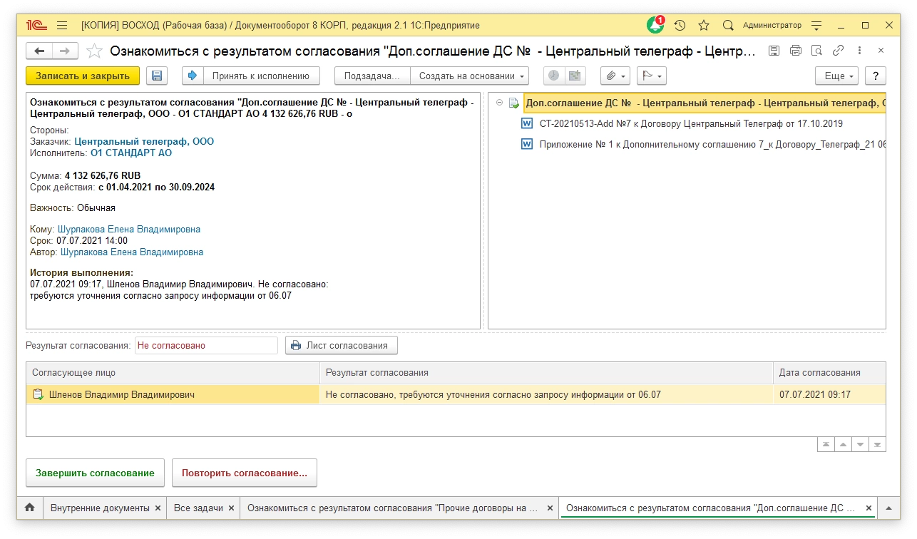 - Повторить согласование (когда можно внести изменения, устранить замечания и исправленный документ, отправить на повторное согласование в рамках этого же процесса).