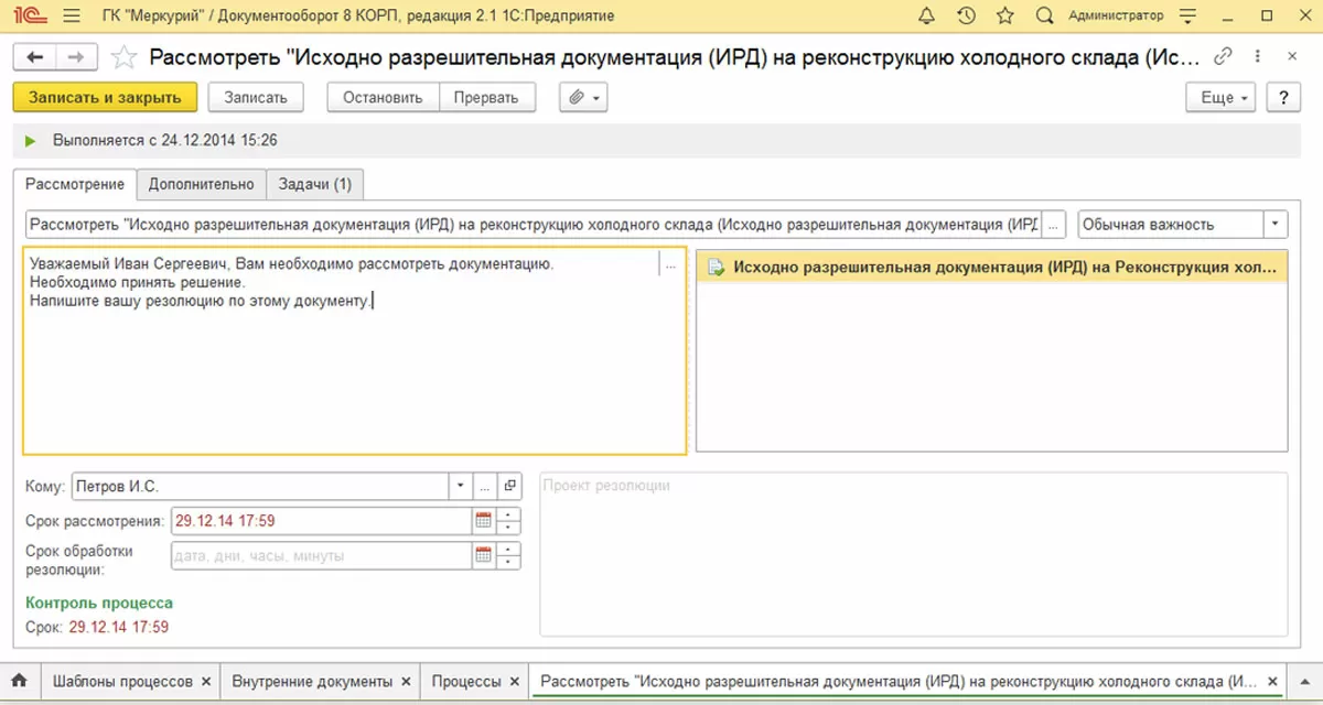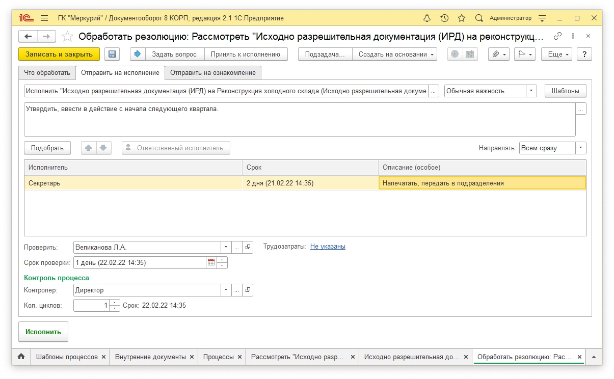 - Руководитель видит проблему и понимает, что ее надо решить. Он (или его помощник) создает процесс исполнения, указывает в нем: что нужно сделать, кому, в какой срок, и назначает проверяющего и контролера: