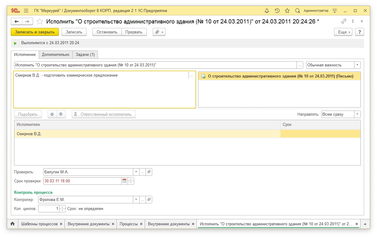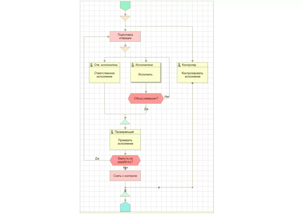 Следует отметить функцию контролера процесса. Его задача - отслеживать сроки исполнения, регламент выполнения. Задача контролировать появится вместе с задачами для исполнителей. Контроль будет автоматически завершен вместе с процессом исполнения.