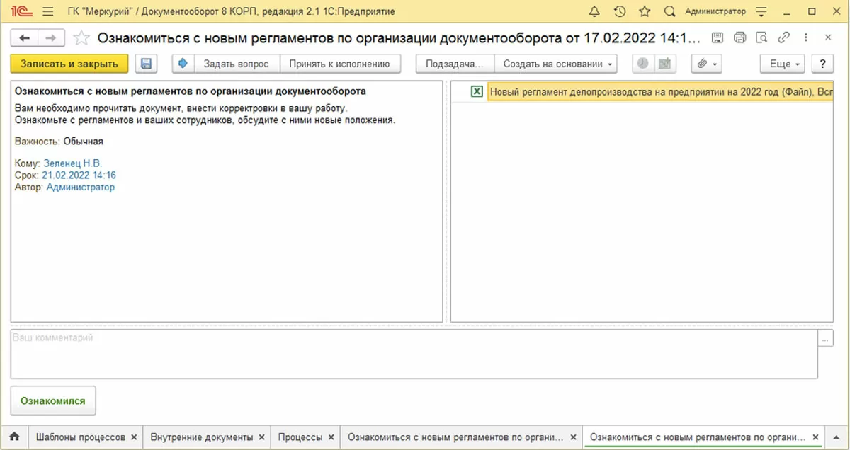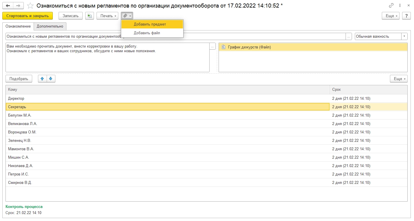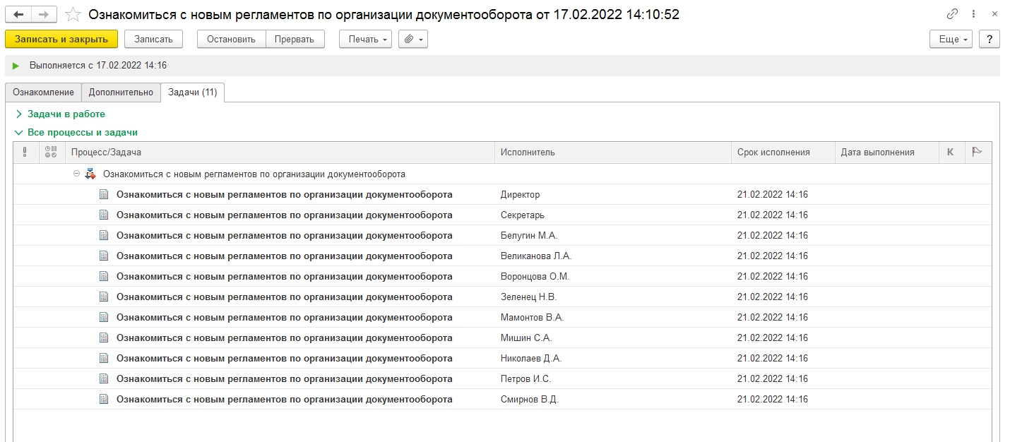 Это довольно простой процесс, но очень нужный. Этот процесс создает задачи для пользователей системы электронного документооборота – «Ознакомиться».