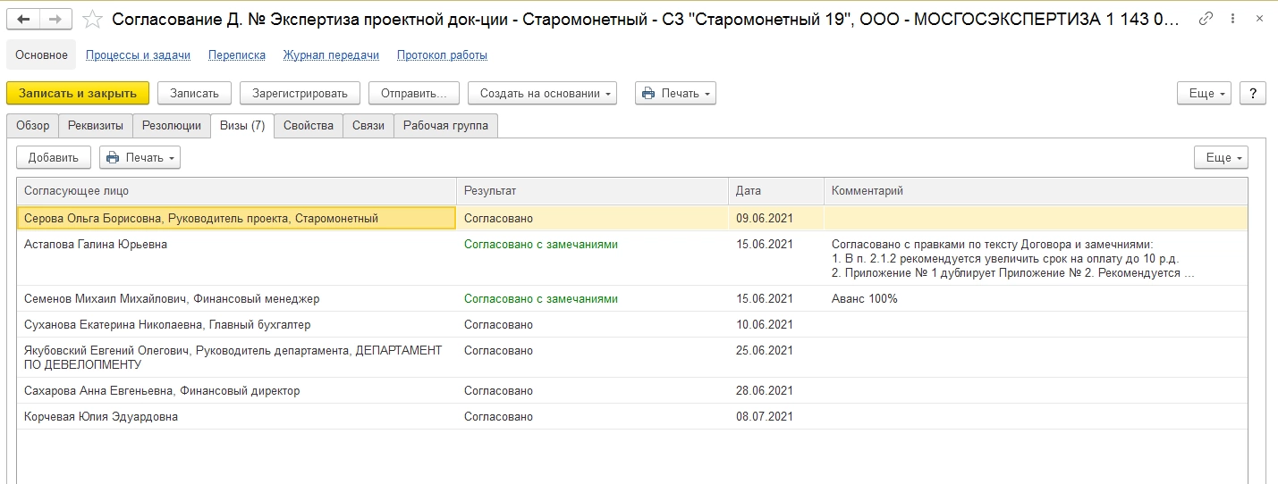 После прохождения согласования на закладке «Визы» в карточке документа собираются результаты согласования, с комментариями согласующих. Там же можно распечатать лист согласования, в том числе с историей, если было несколько циклов согласования.