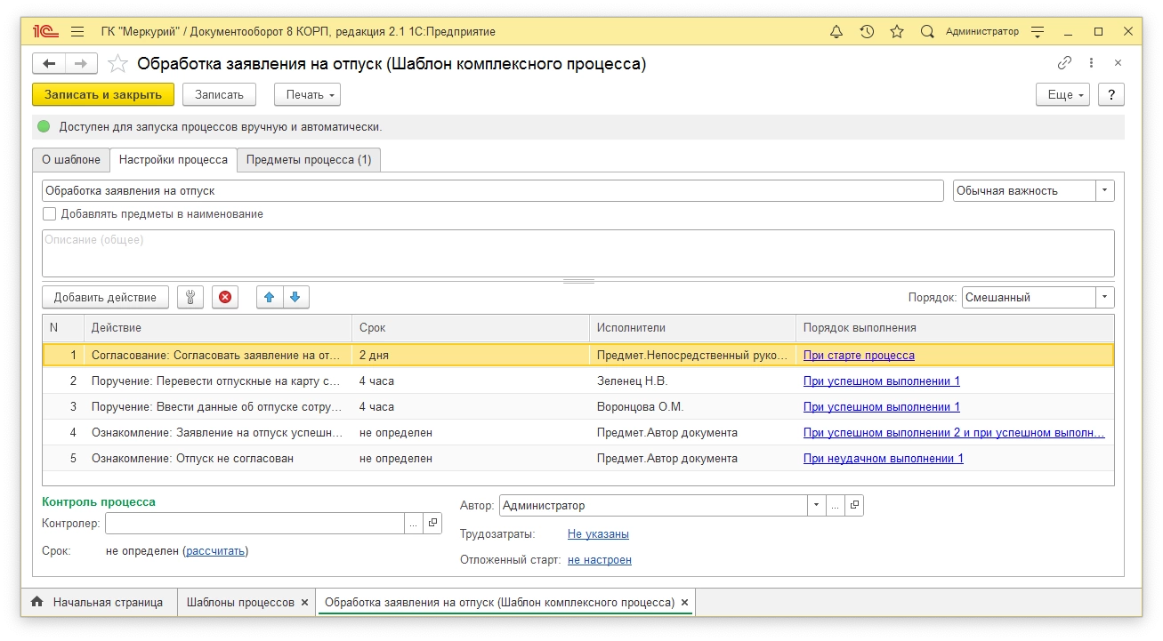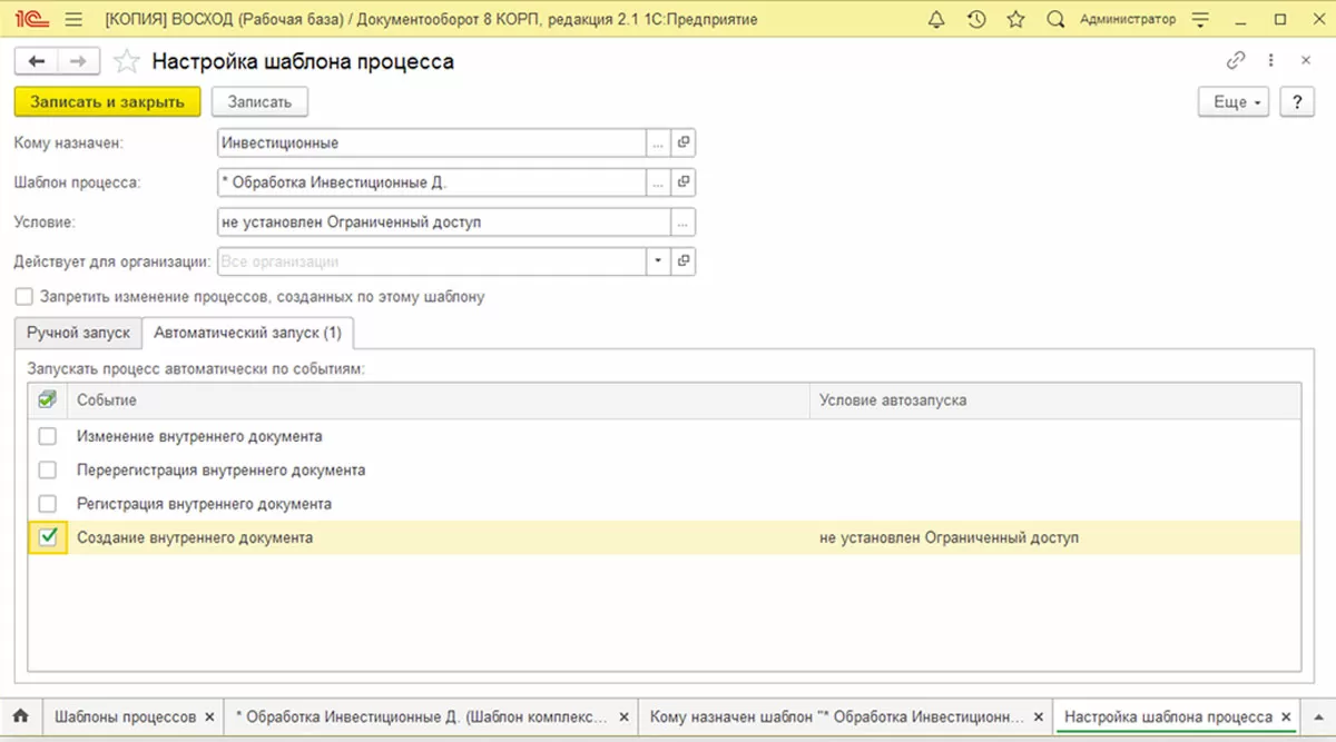 Для шаблонов процессов предусмотрена возможность автоматического старта процесса. Это позволяет стартовать процесс по событию без участия пользователя. От пользователя требуется просто аккуратно по шаблону создать новый документ, заполнить в нем все поля, прикрепить файлы и нажать кнопку «Записать и закрыть». Назначенный для таких документов процесс стартует автоматически.