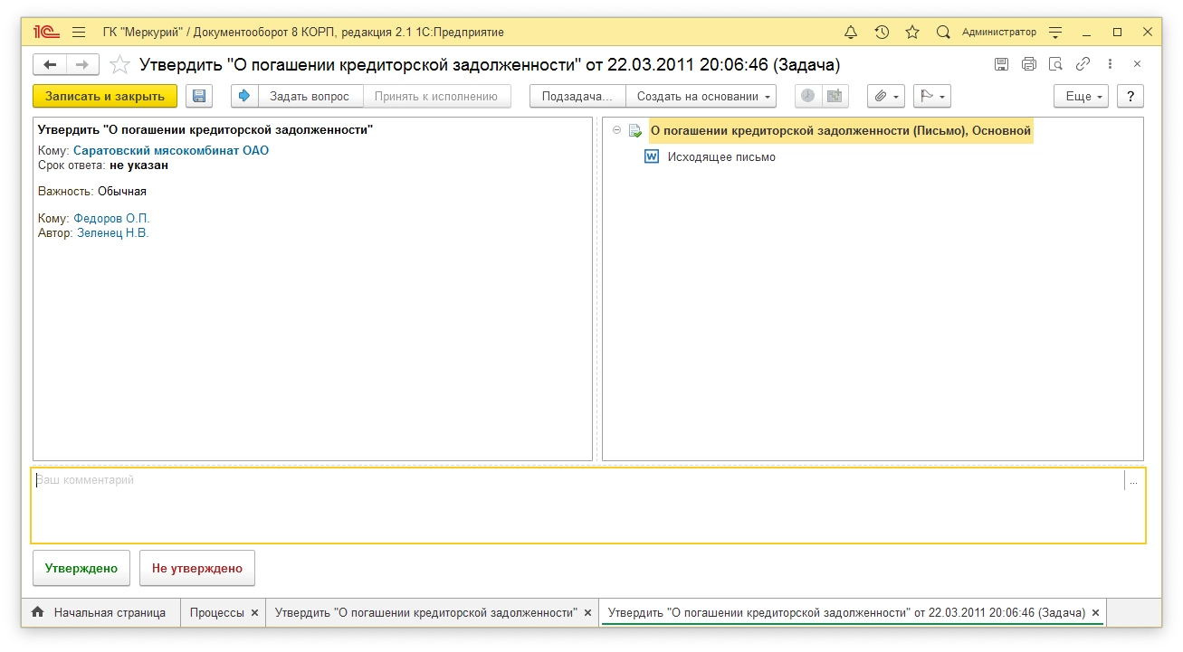 - Не утвердить (должен быть обязательно написан комментарий к этому действию).