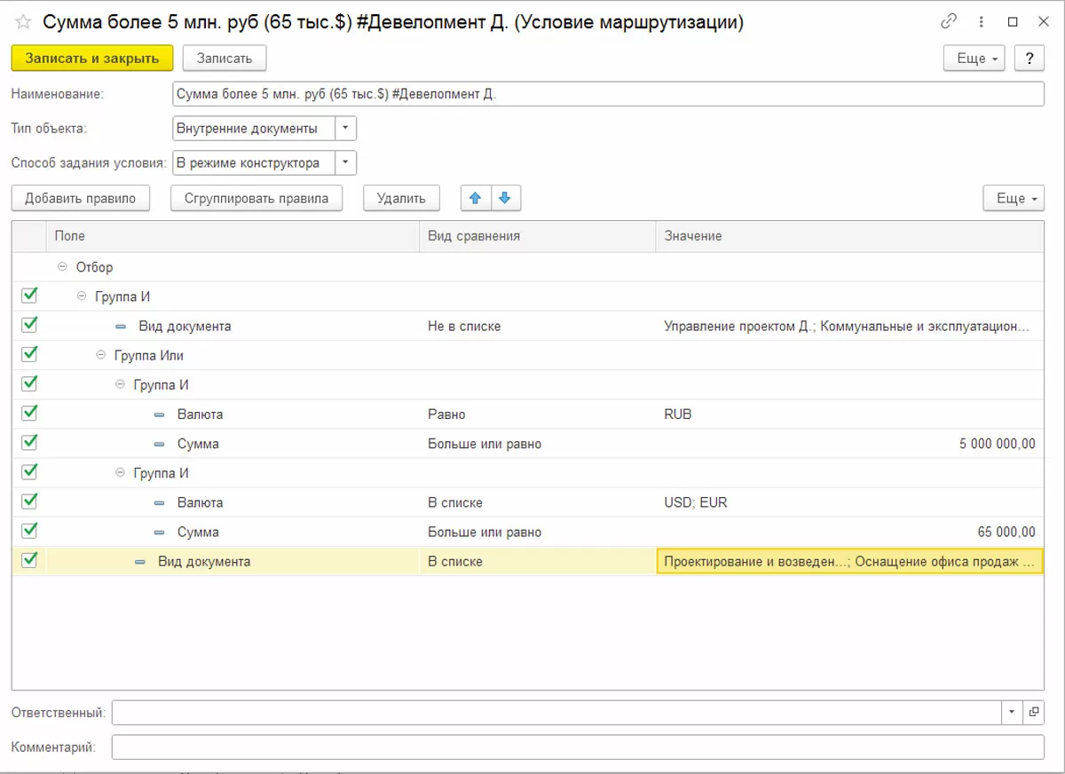 При настройке шаблонов процесса исполнения могут быть использованы условия, при которых исполнители подключаются или нет к выполнению задачи. Например, если сумма в документе более 1 млн рублей, то соисполнителем должен быть добавлен финансовый директор.
