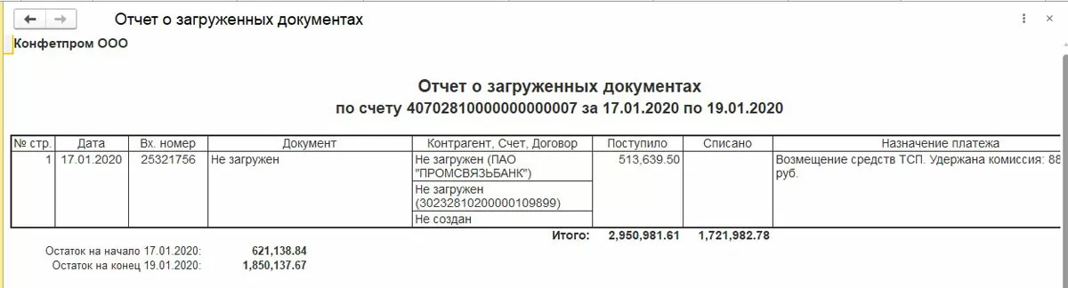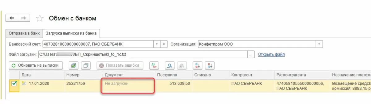 Если выписка банка в 1С 8.3 была загружены частично, система отобразит эту информацию в табличной части окна «Обмен с банком». Не загруженные документы будут отображаться со значением «Не загружен» в столбце «Документ», по загруженным документам будет отображена информация «Списание с расчетного счета или Поступление на расчетный счет», присвоенный ему номер и дата.