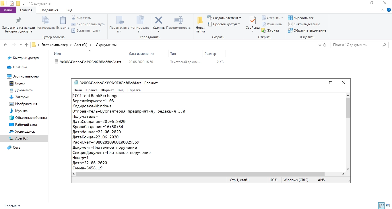 Сформируется файл в формате «1С_to_kl.txt», который необходимо загрузить в банк-клиент.