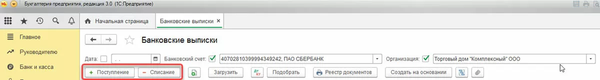Второй путь создания «Поступление на расчетный счет» и «Списание с расчетного счета» путем загрузки банковской выписки
