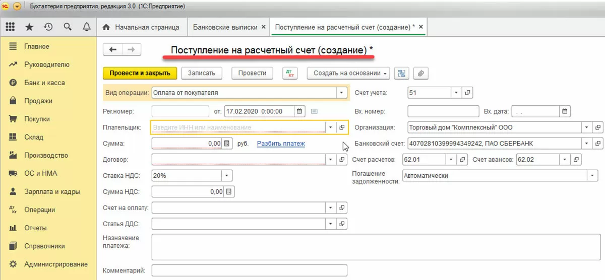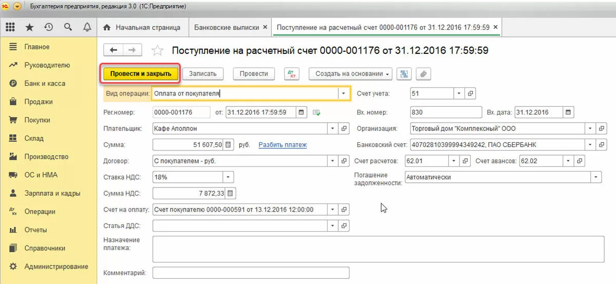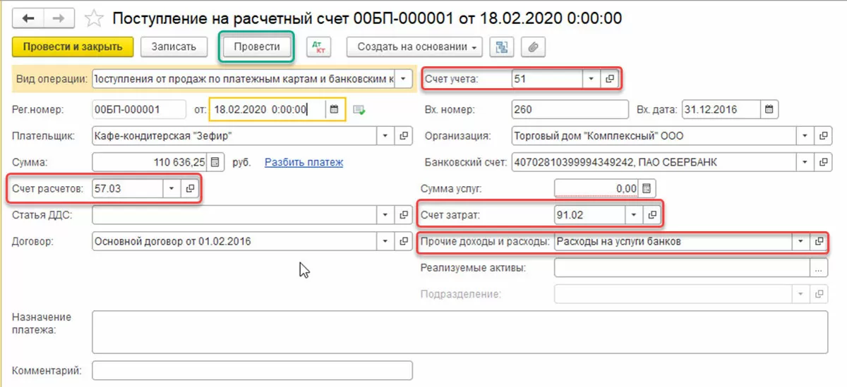 Провести и разнести выписку самостоятельно будет нужно, если она не отмечена зеленой галочкой: открываем не проведенный документ, заполняем основные необходимые поля для проведения документа, проверяем корректность заполненных реквизитов, нажимаем на кнопку «Провести», далее «Провести и закрыть».